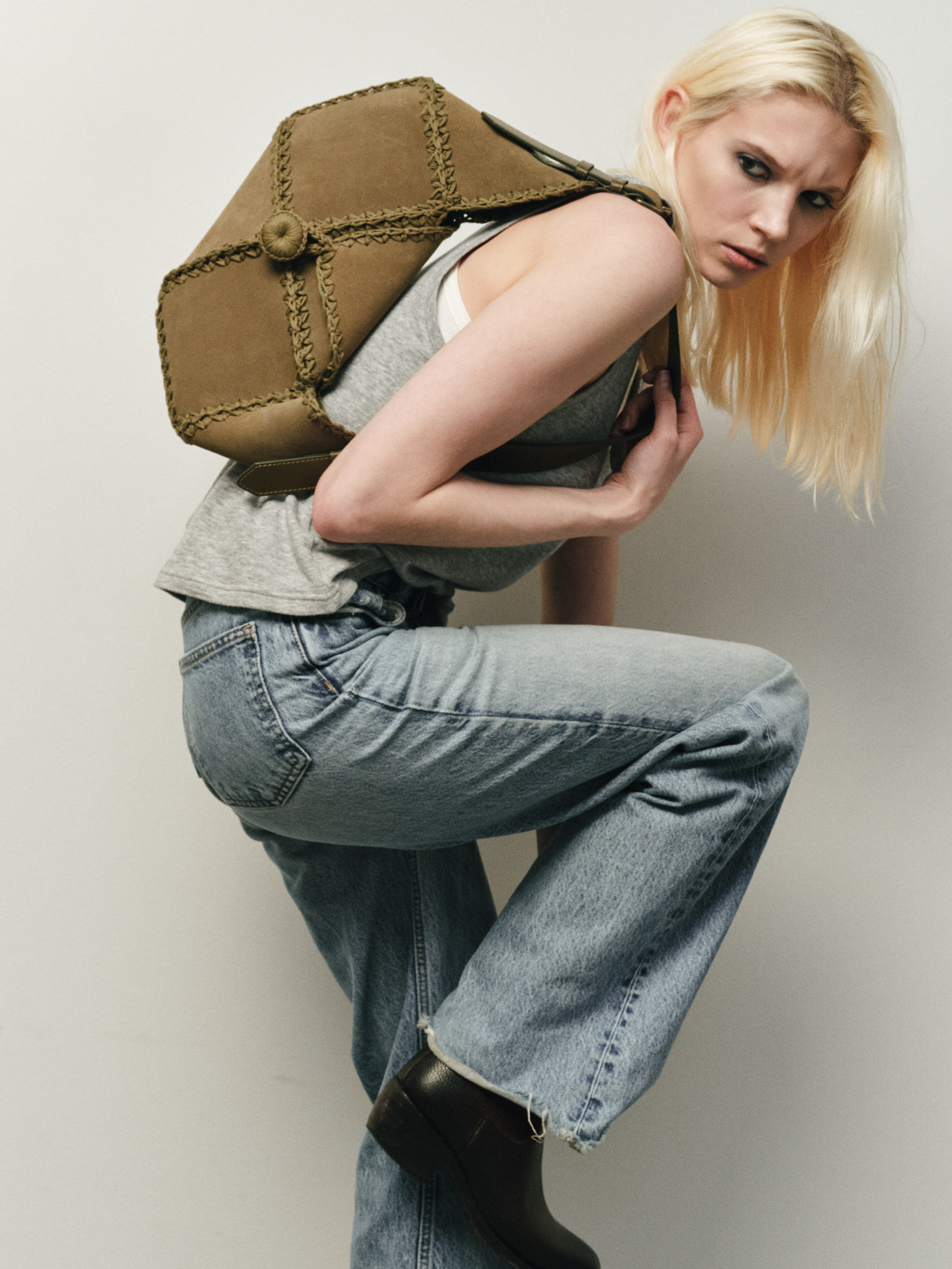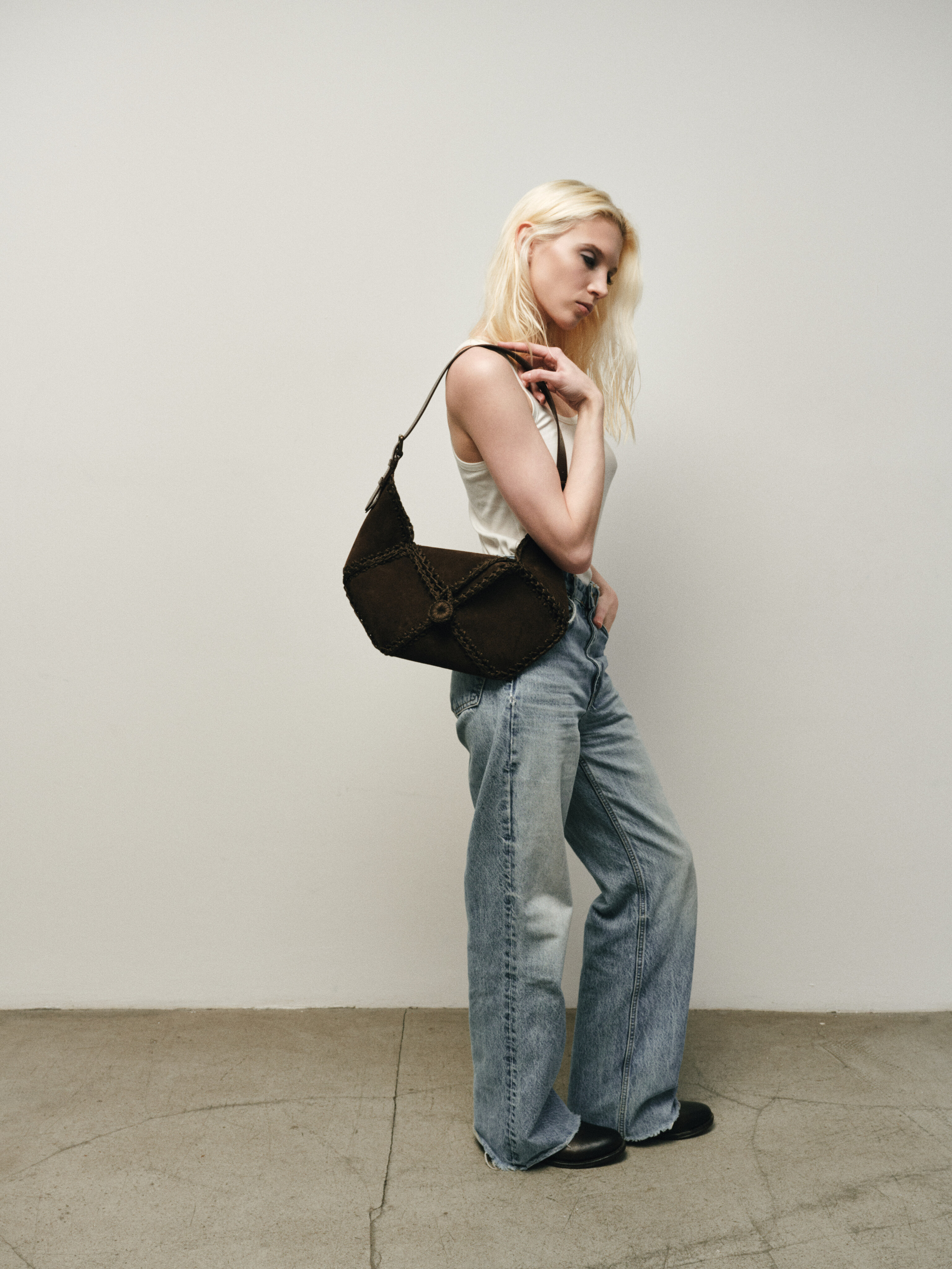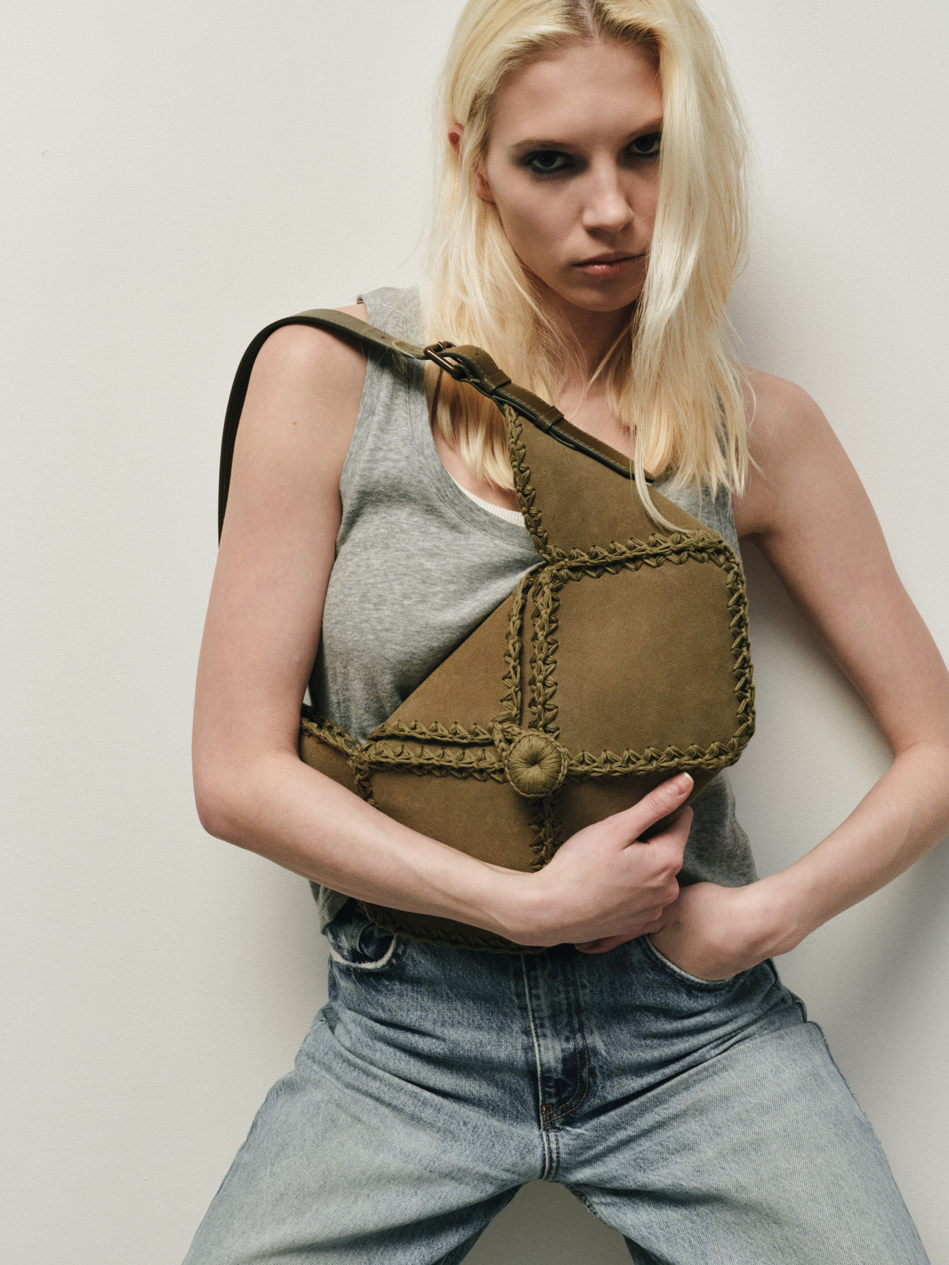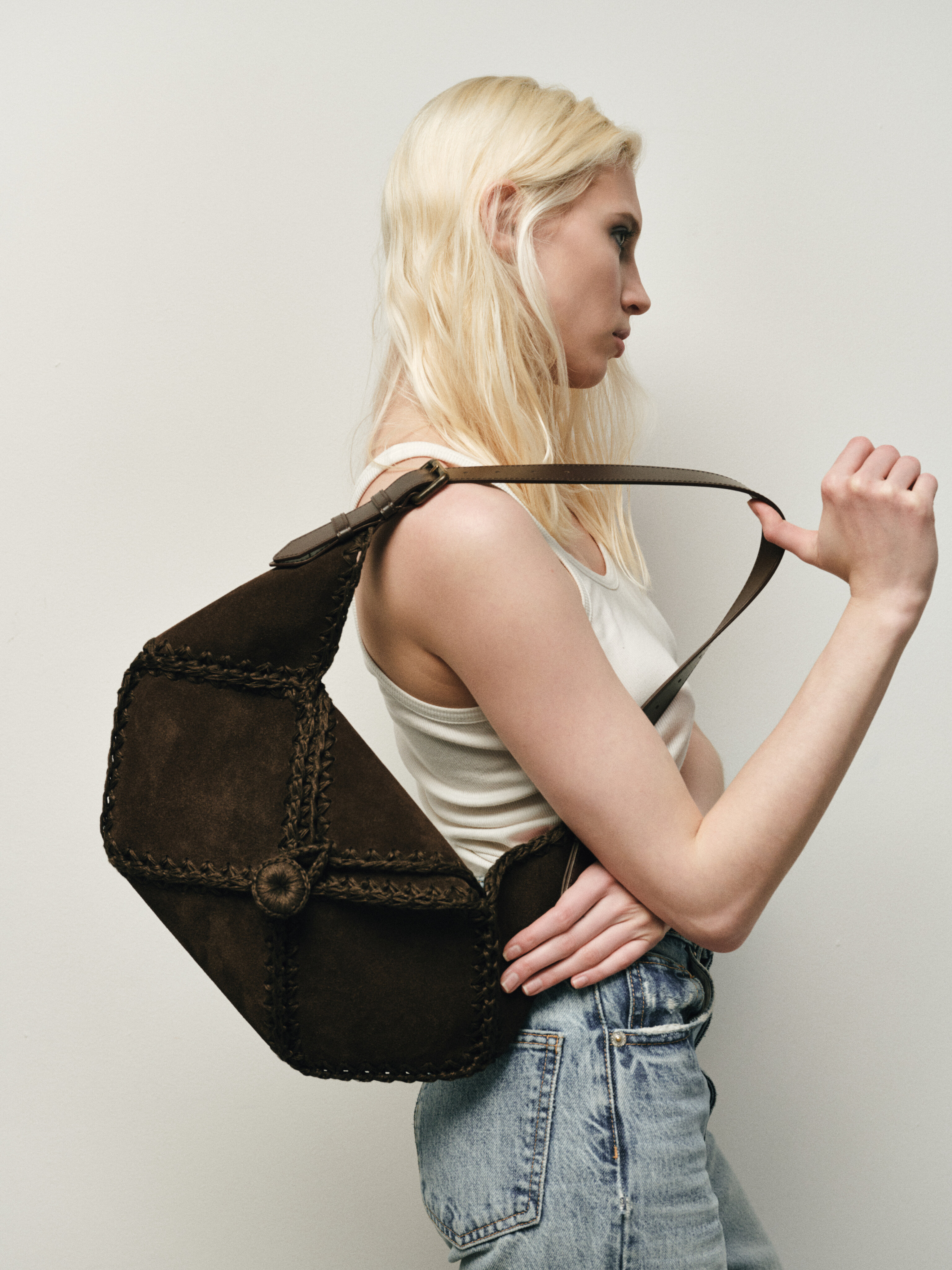 В данной модели мы используем замшу на лицевую часть сумки, она дает приятную на ощупь и визуально текстуру. А внутри и на ручке мы используем гладкую кожу, так как это практично.